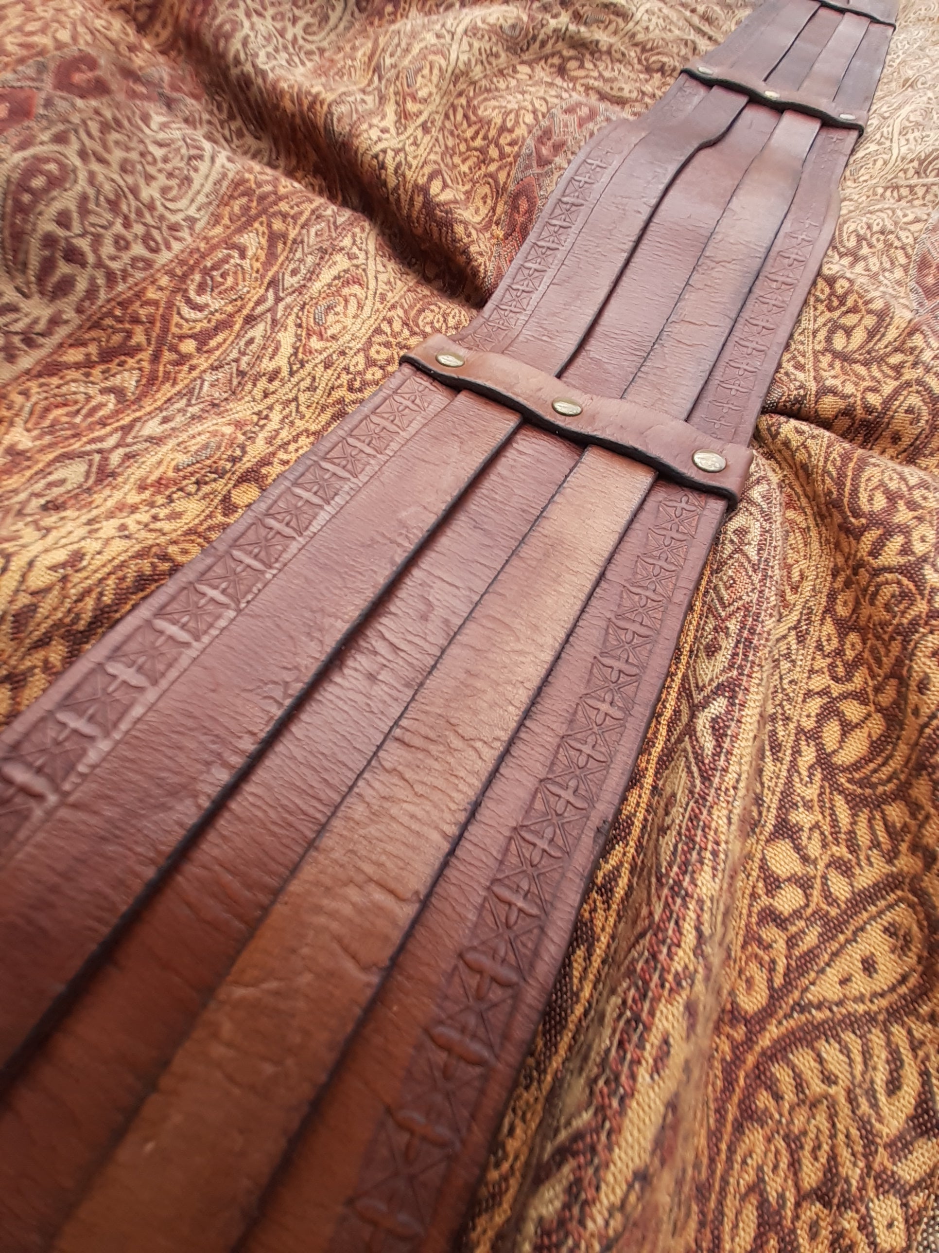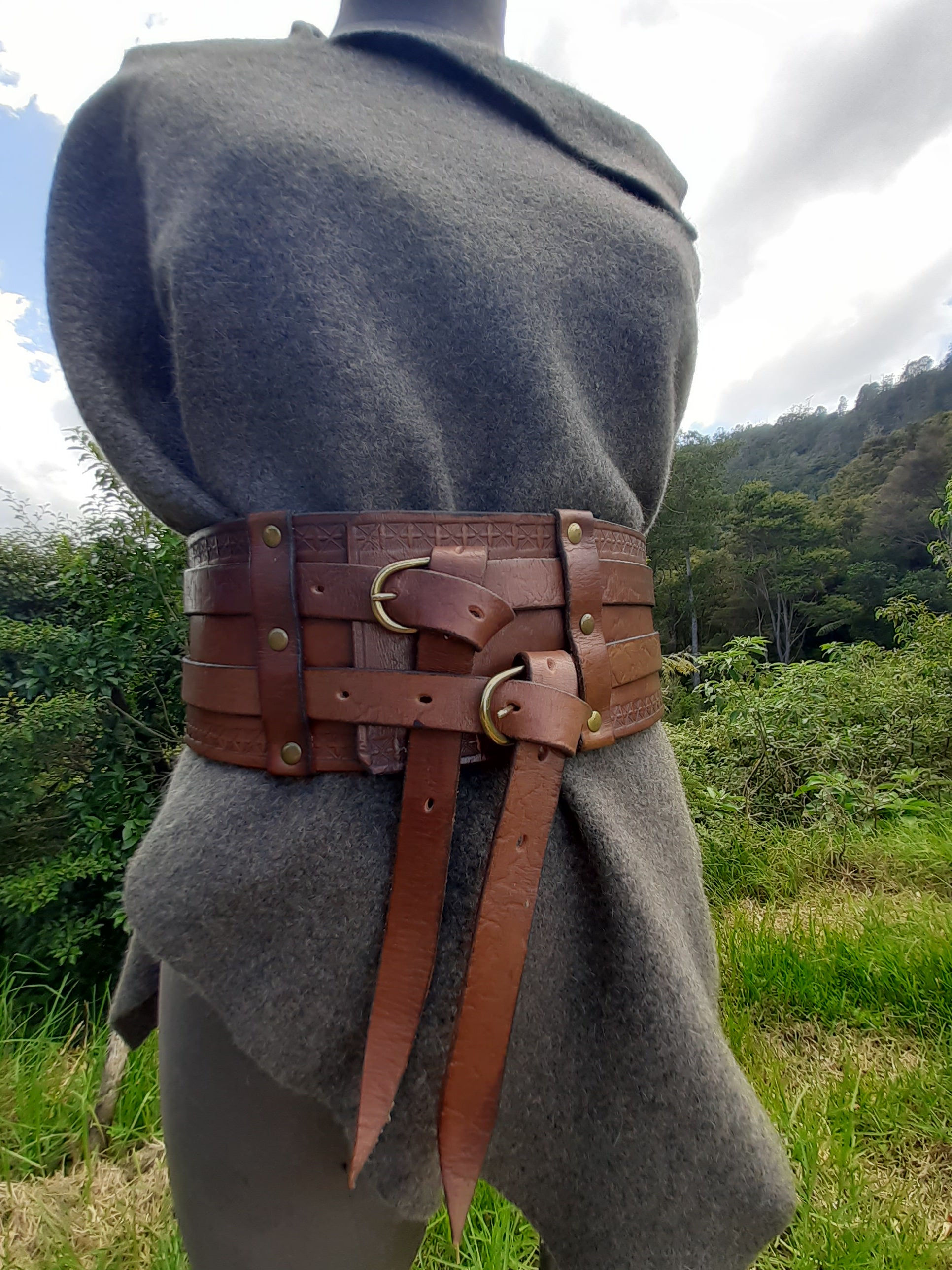 Wide double buckled hero style belt with ring detail and solid brass buckles. Removable over belts let you easily add all the pouches, scabbards and other accoutrement you need.